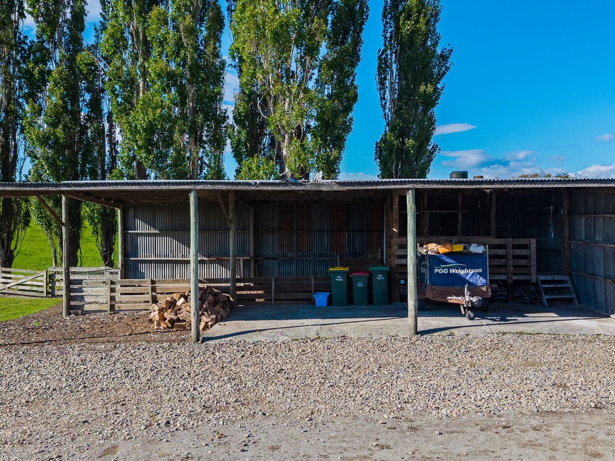 Outside, a separate three-bay shed complete with shearing pens and yard, a double garage, storage shed, and a fenced orchard — ideal for those seeking a manageable lifestyle block with room for animals, hobbies, or homegrown produce.