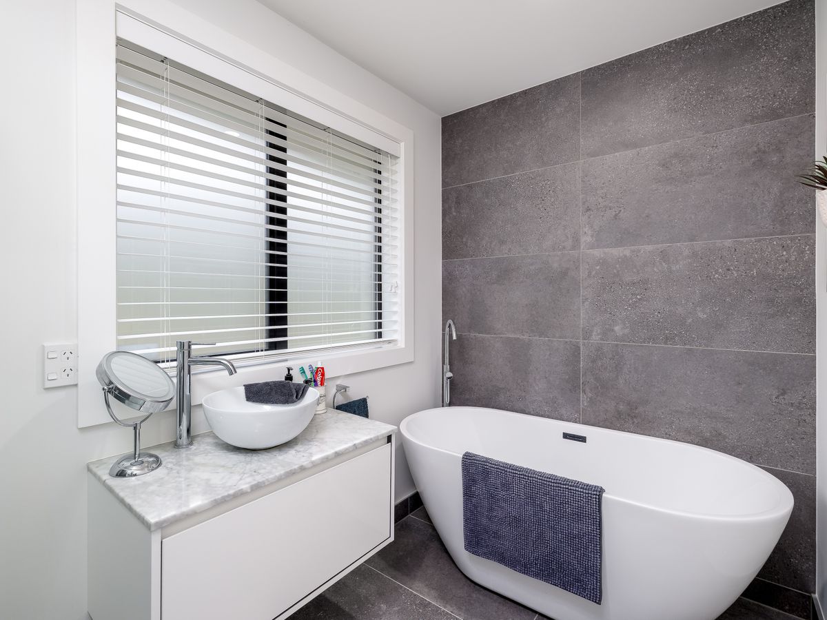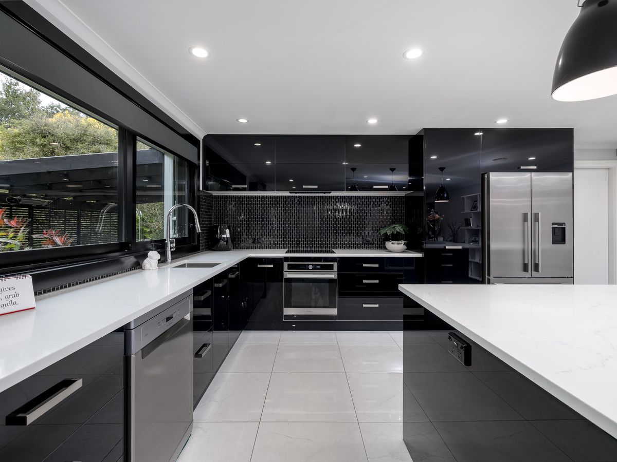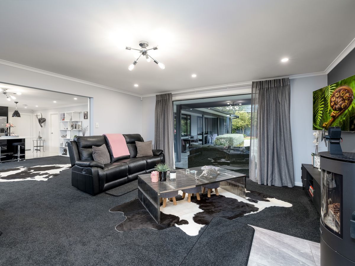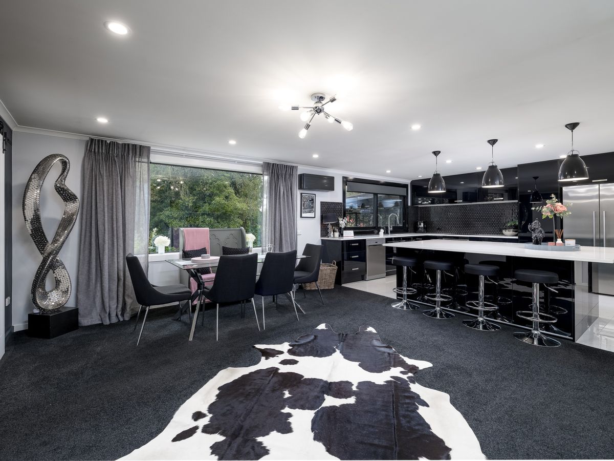 At the heart of the home is the stunning black kitchen, a true showstopper with engineered stone benchtops, an oversized breakfast bar, quality appliances, and an exceptional scullery that cleverly incorporates laundry and storage. Double barn doors open into a plush living space where a large picture window frames sweeping garden views, creating a calm and inviting atmosphere.