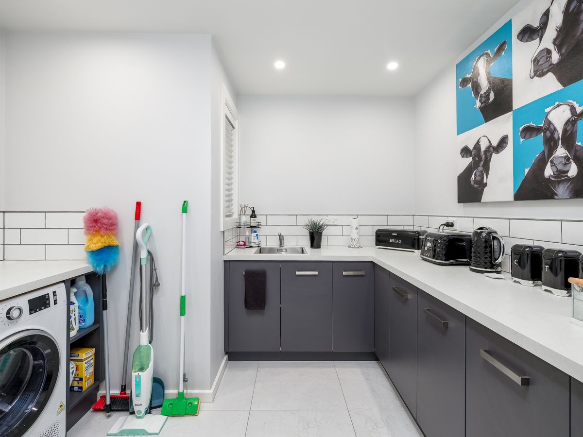 Four generous double bedrooms provide space for family or guests, complemented by a modern tiled family bathroom and a separate, stylish toilet. Off the kitchen, two large utility rooms offer incredible flexibility—ideal as a home gym, man cave, hobby space or teenager retreat. A covered rear entrance connects to a single garage with drive-through access.