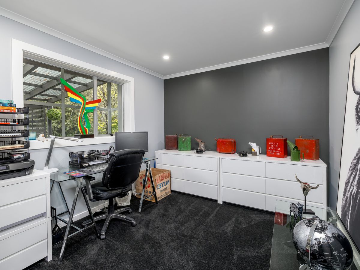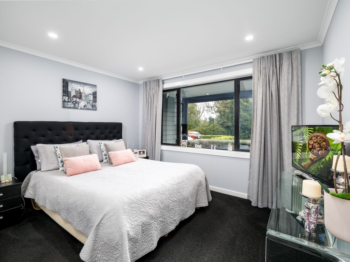 The grounds are equally impressive, with water supplied via a well and a new 30,000-litre tank, a large double garage shed, a tunnel house, vegetable garden beds, and established fruit trees. Mature gardens are beautifully lit with bollard lighting, there’s ample off-street parking, and on this picturesque 9,105sqm section, kids have endless space to play and explore. The inviting driveway and feature entrance complete the sense of arrival.